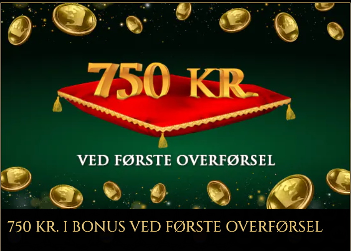 - Ved første indbetaling: 100 % bonus op til 750 kr. (minimumsindbetaling: 100 kr.)